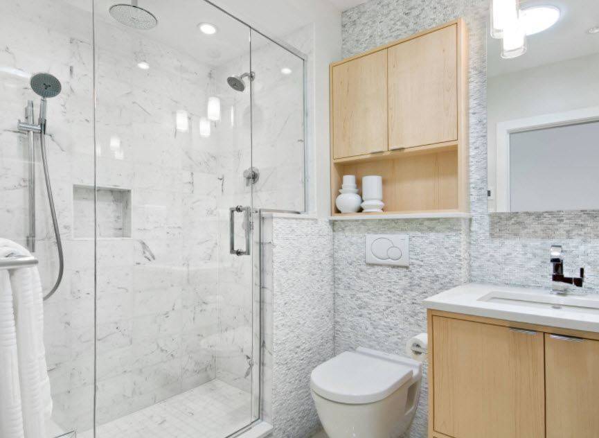 Сантехника в таких ванных должна быть только белой. Особенно это касается совмещенных санузлов. Чем менее заметны предметы обстановки, тем более просторной кажется комната.