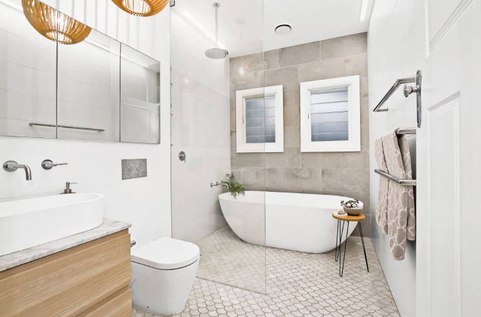 Минус белоснежных ванн в том, что у многих они вызывают ассоциации, связанные с больницей. Стерильная комната с минимальным набором предметов первой необходимости не отличается особым уютом. Проблема решается с помощью тёплого освещения и стильных аксессуаров.