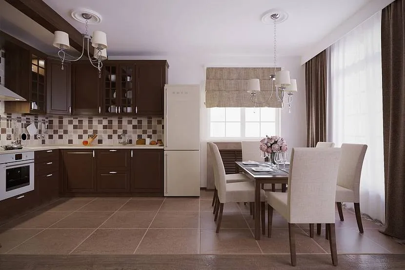 Декор, имитирующий древесину, подходит для совмещенной кухни. Кухонную рабочую зону выложите керамогранитом, а для гостиной или столовой возьмите ламинат или паркет с похожим оттенком и текстурой.