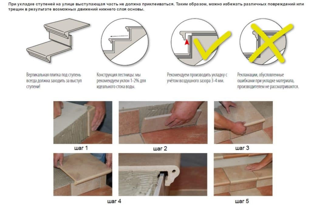 Чтобы стык был идеальным, плита должна быть на одном уровне со ступенькой. Допускается, чтобы плитка была немного шире. Если после укладки остались выступающие места, то их необходимо срезать. При облицовке уличных ступеней делают наклон 1-2 градуса, чтобы вода беспрепятственно стекала и не оставалась на поверхности. Профессиональные мастера советуют оставлять сбоку тонкий канал для стекания влаги.