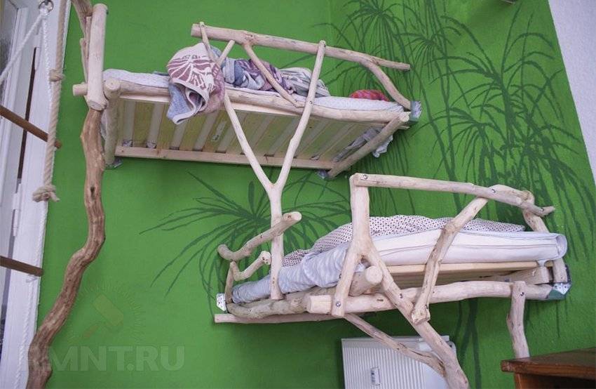 Роль ножек при такой двухъярусной кровати играют вертикальные стойки каркаса, сборка проводится с помощью шурупов или других видов соединения. Нижней части ножек можно самостоятельно придать любую декоративную форму. Красиво смотрится резное дерево: обработку ножек можно предварительно заказать в токарной мастерской. Круглые фигурные ножки кровати станут важным элементом декора детской.