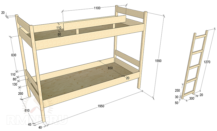 Когда чертеж закончен и размеры рассчитаны, отправляйтесь за покупками. Древесина, предпочтительнее массив сосны, потребуются полочные балки, лестничные балки, доска для распорок и бортиков, набор реек для дна коек. Подготовьте инструмент и расходный крепеж.