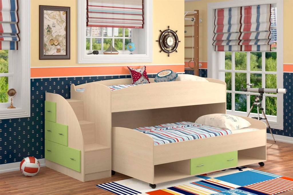 Даже в достаточно просторной детской комнате есть смысл установить этот функциональный и компактный вид мебели, освободив таким образом значительную часть пространства для подвижных игр.