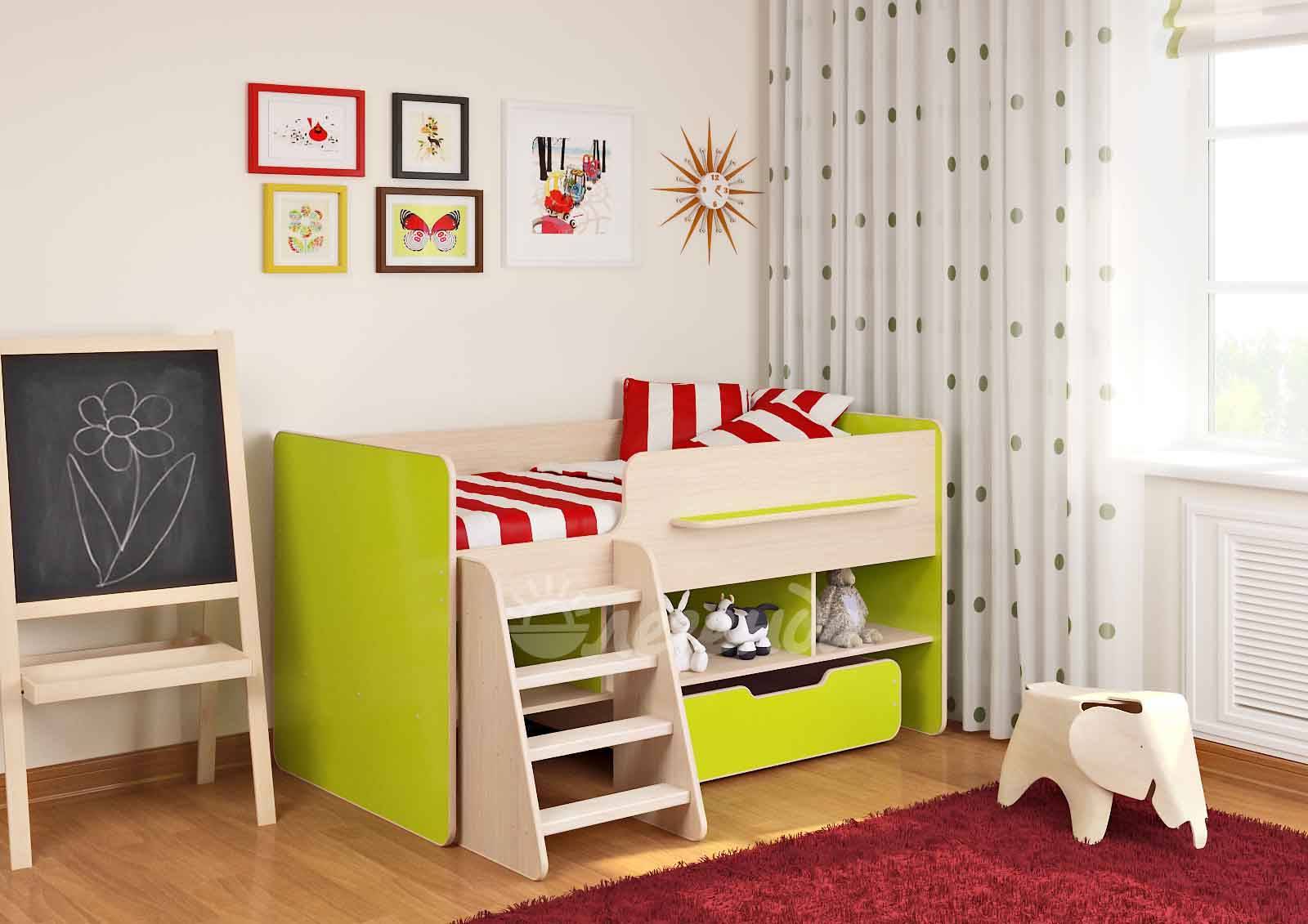 - Кровати, предназначенные для детей от 2 лет. Так как малышам не рекомендуется спать высоко, выпускаются мини-чердаки. Площадь их не более 2 м2. Внизу располагается игровой уголок или шкафчики для хранения вещей. Сама кровать-чердак низкая, не выше 1 м от пола. Обычно оформляется такая мебель красочно, у нее привлекательная форма, широкие ступеньки и высокие бортики. Часто оснащена горкой.