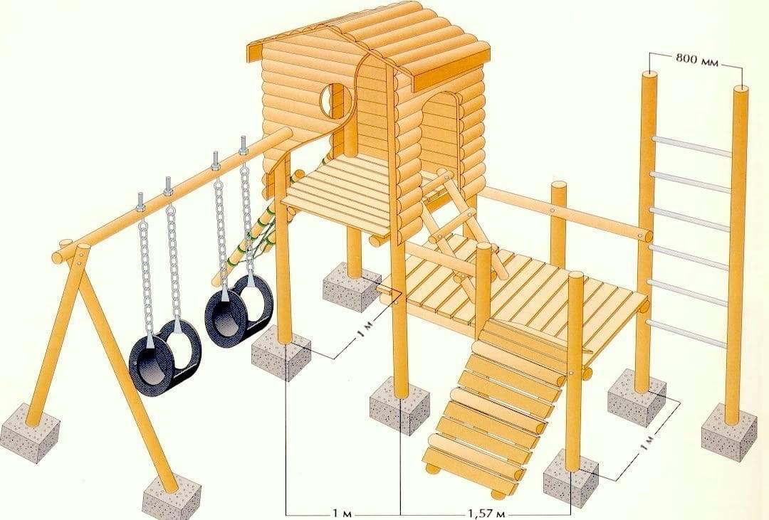 Опорные элементы, то есть закладные качели, горки и других сооружений, углубляются в почву не меньше, чем на 0,5 м