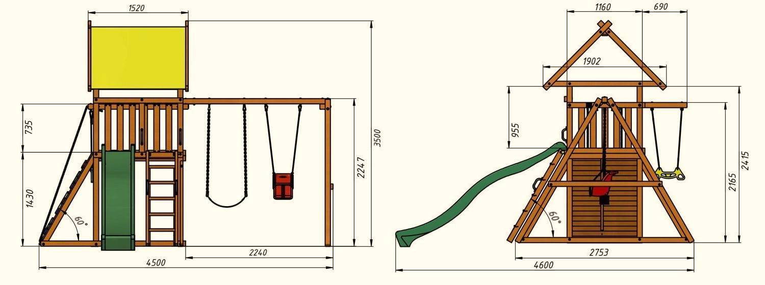 - Для детей чуть постарше, высота горки от 250 до 350 м, а качели – 250 см.