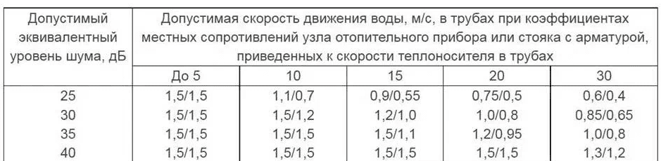 Максимальные показатели скорости движения воды в тепловых контурах указаны в приложении Ж к СНиП 41-01-2003. В документе они не зря связаны с уровнем шума – при слишком быстром протекании теплоносителя батареи шумят и булькают.