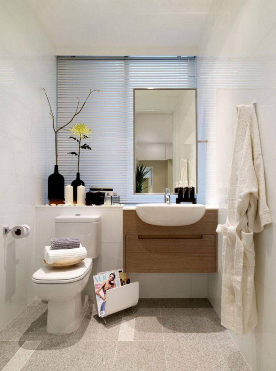 Перед вами пример , в котором учтено сразу несколько базовых рекомендаций специалистов по расширению пространства. Обратите внимания на подобранную плитку, она спокойных, неярких оттенков, что сразу же зрительно добавляет пространству объем, также она имеет средний размер и не квадратная, а прямоугольная. Из-за этого помещение немного вытягивается вверх, что очень хорошо в случае с низкими потолками, что встречается, скажем, в хрущевках. Также необходимо сделать акцент на использовании подвесного унитаза, что не только дает нам свободное пространство на полу, но и позволяет получить удобную и функциональную полку, в которую монтируется бачок. Благодаря этому можно ограничиться единственным закрытым шкафчиком возле зеркала для хранения предметов личной гигиены. Кстати, ограниченный набор мебели – это также прием по визуальному увеличению площади, ведь чем проще ее линии и чем ее меньше, тем свободнее и легче вам будет дышать, когда вы будете находиться там. Свет должен литься из нескольких источников, желательно расположенных по всему периметру, тогда он будет достаточно ярким и равномерным, отражаться от глянцевой поверхности кафеля и превращать комнату скромных размеров в, по крайней мере, стандартную.