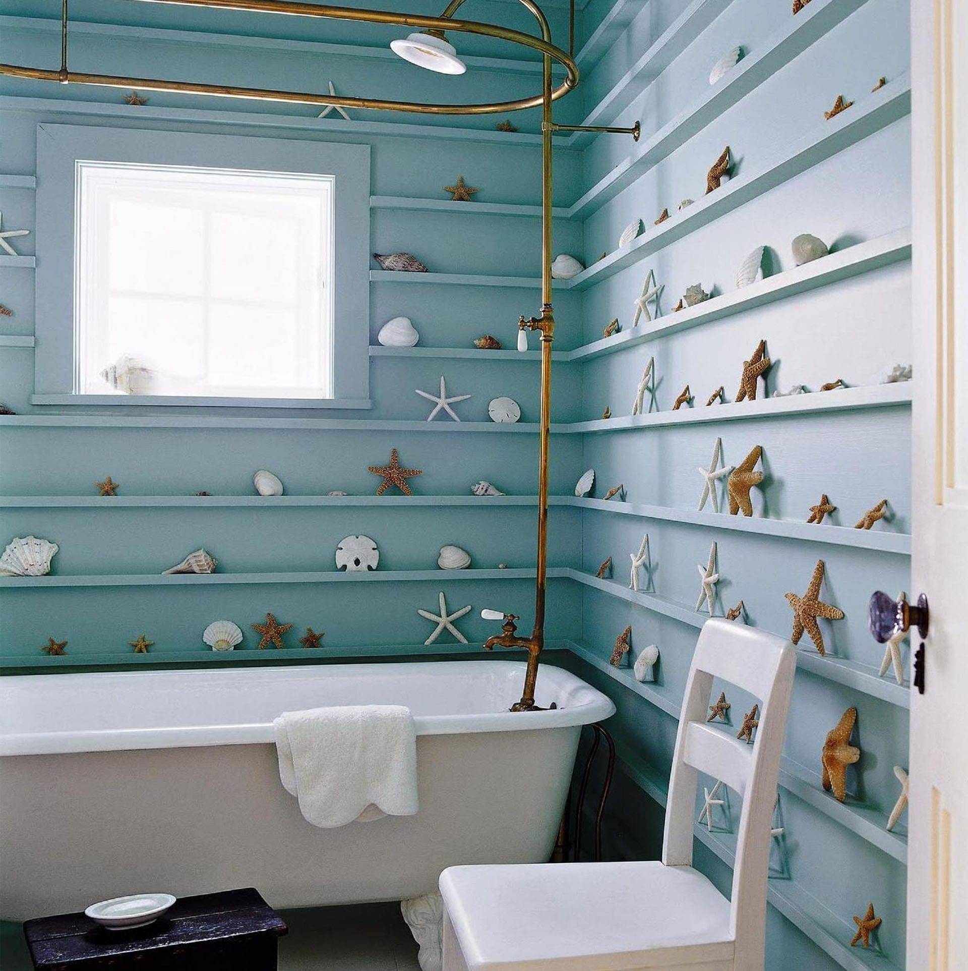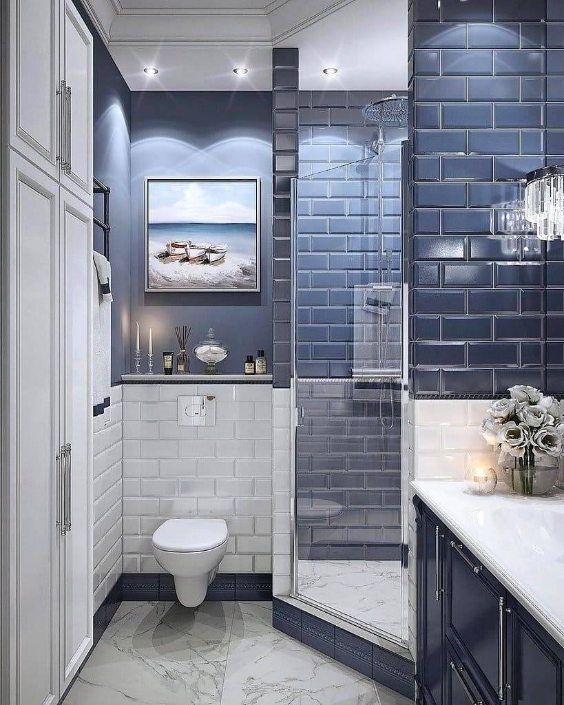Синий — это естественный цвет воды, поэтому ванная комната часто оформляется именно такими оттенками. Для оформления комнат используют разные оттенки: морской, небе, аквамарин.