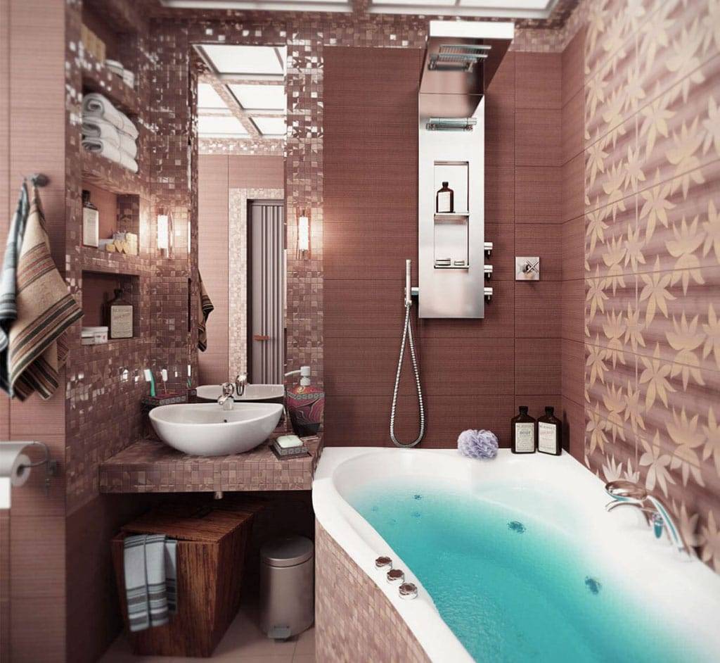 Расширить пространство помогут глянцевые и зеркальные поверхности. Исходя из этого, можно выбрать для оформления маленькой ванной глянцевую керамическую плитку. «Фартук» возле раковины выложите зеркальной плиткой или мозаикой – для организации дизайна ванной 2 на 2 метра или меньше такое мозаичное панно станет элементом декора.