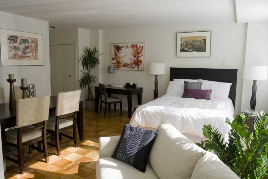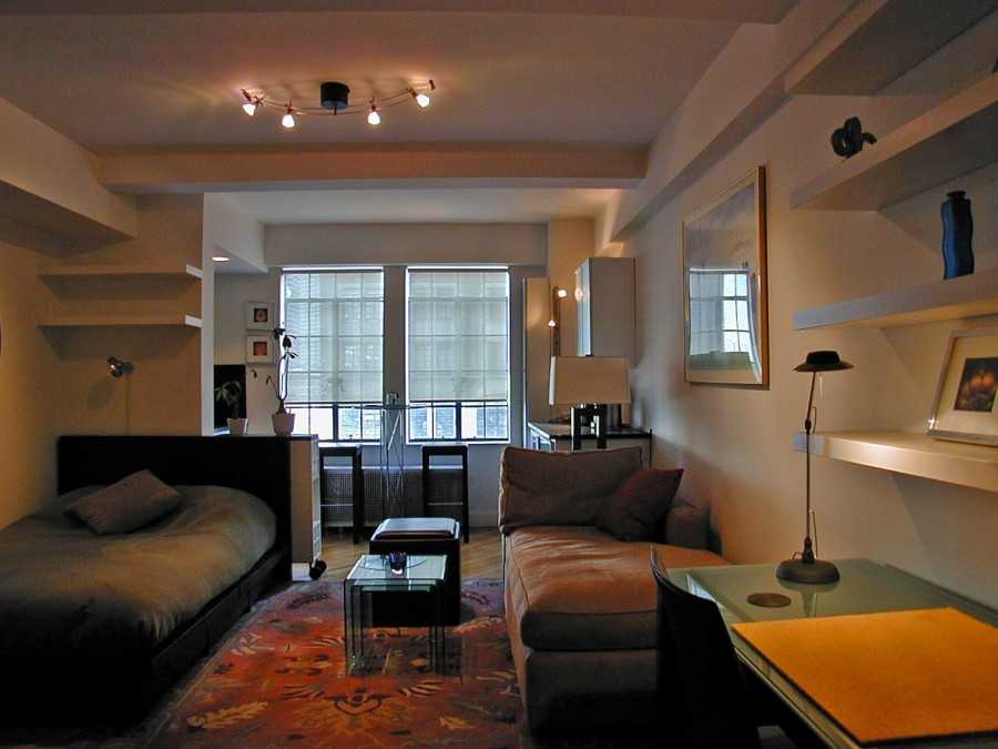 Небольшие апартаменты площадью менее 40 квадратных метров. При проведении перепланировки необходимо провести грамотное функциональное зонирование и выделить пространство под спальню, кухню и обеденный блок, ванную комнату. Создайте эргономичные места для хранения вещей.