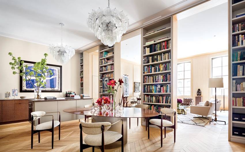 Гостиная-кабинет. Если гостиная не объединена с кухней, выделить в ней место для рабочего кабинета не составит труда. Для этого можно использовать перегородку в виде двухстороннего стеллажа, который еще и станет полноценным дополнением интерьера.