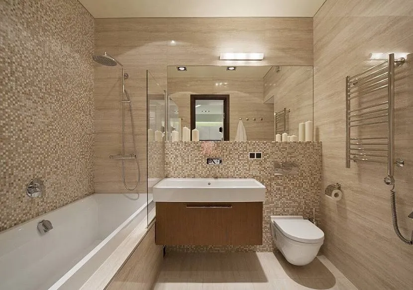 Дизайн ванной комнаты, совмещенной с унитазом, сохранит эстетику, если удастся избежать наличия разбросанных вещей. Подвесные стены и гипсокартонные коробки, мебельные фасады помогут замаскировать некрасивые детали. Используются пластиковые экраны, гидрозатворы, облицовка каркасных конструкций плиткой.