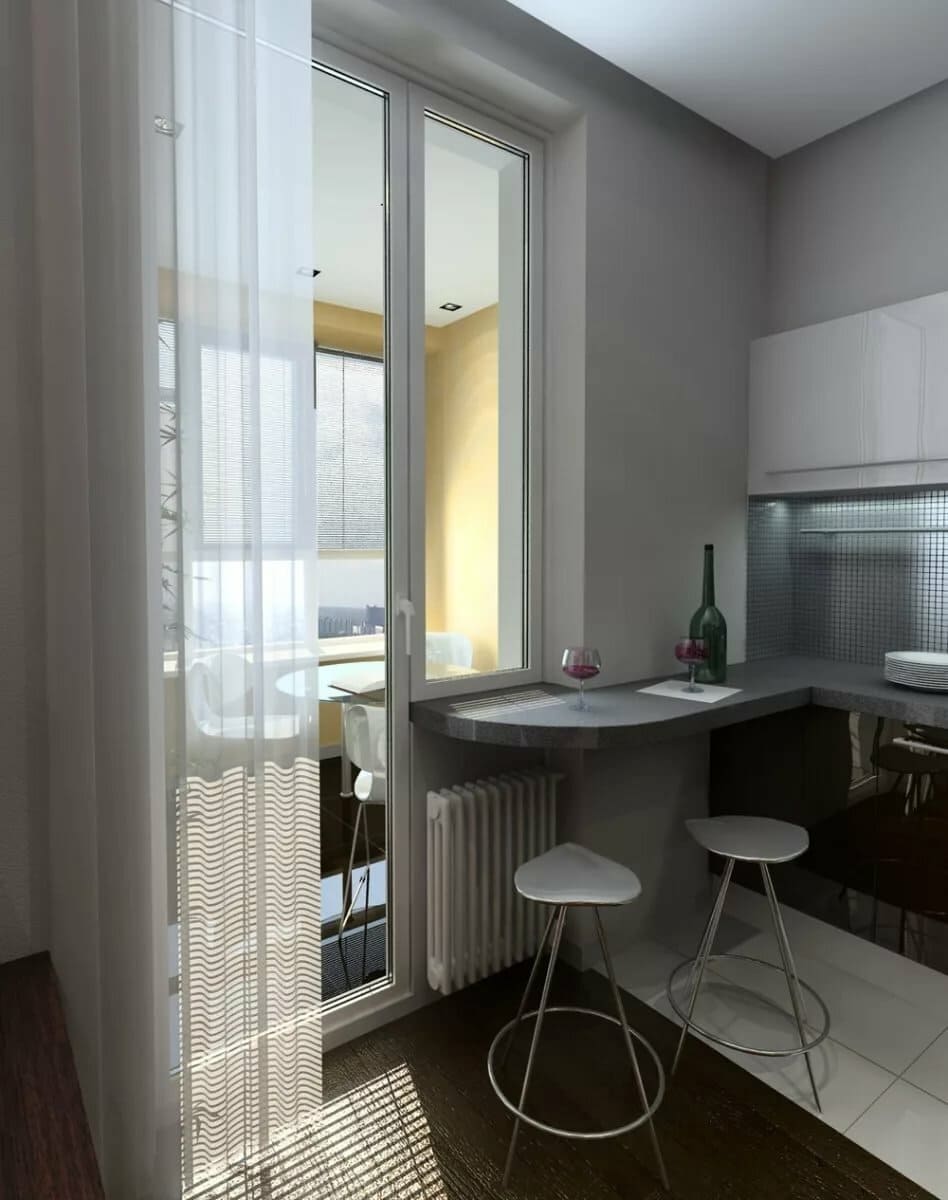 Стол и стулья не должны занимать много места. Лучше вообще остановиться на табуретах или подобрать складные стульчики. При этом стол также может быть складной – если хорошо поискать, то ты найдешь модели, которые легко крепятся на стене.