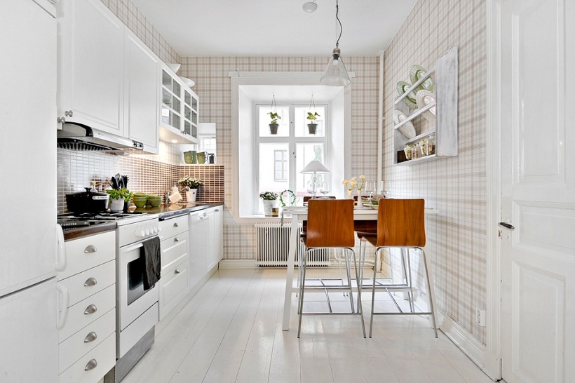 А теперь поговорим об отделке. Когда кухня экстремально мала, значение имеет даже то, как уложен пол и оформлены стены. Так, отделка пола широкими и длинными досками, а также облицовка стен обоями с большим и ярким принтом, «съест» и без того крохотное пространство. Зато правильная отделка поможет здорово его расширить.