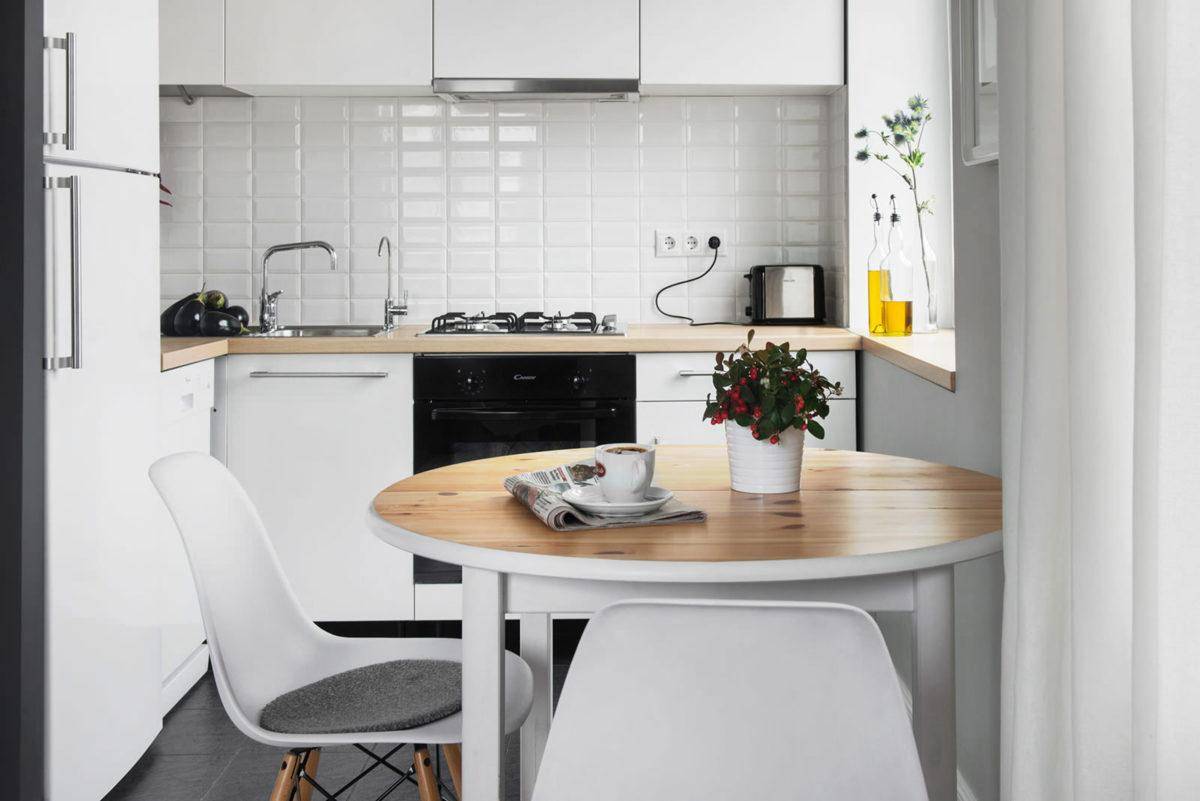 Минимум лишних предметов, акцент на прямых линиях, просторе и свете — это то, что нужно для небольшого помещения. Подбери светлые кухонные шкафчики и тумбы, отдай предпочтение встроенной технике, а обеденную зону перенеси в другую комнату. Кстати, подоконник можно трансформировать в столешницу — здесь можно и готовить, и перекусить.