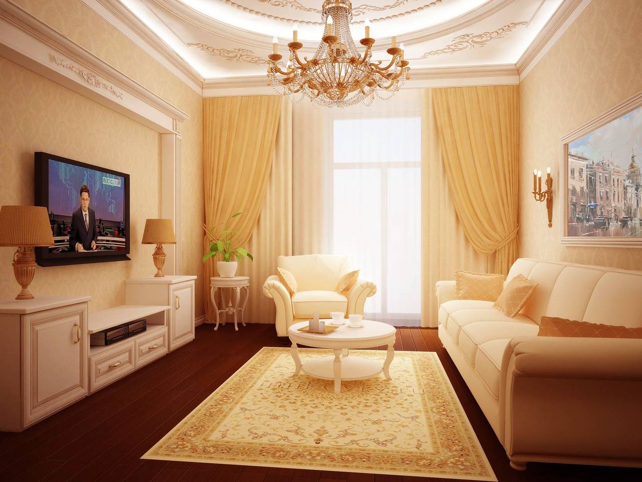 Интерьер гостиной в классическом стиле предполагает обилие света. Обязательно должна присутствовать большая массивная люстра с подвесками из хрусталя или декоративного стекла. Как правило, это изделия, корпус которых имеет плавные изогнутые линии. Классические люстры правильной круглой формы, тяжёлые, снабжены множеством мелких деталей.
