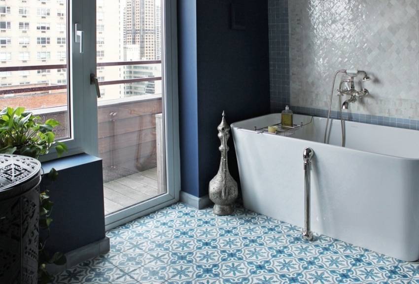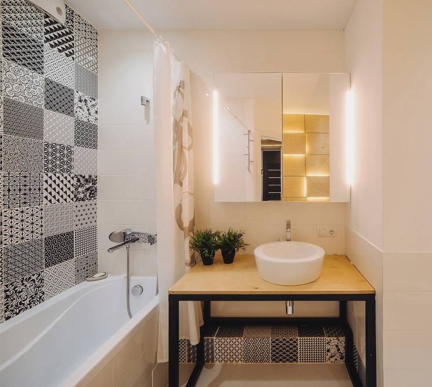 За счет комбинирования с узорчатой плиткой можно добиться оригинальности интерьера.