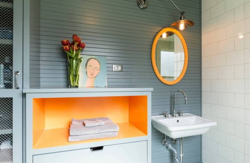 Чистый серый (без желтого или синего оттенка) грубоват, но легко сочетается. В ванной он умеет быть достаточно сдержанным, чтобы не привлекать слишком много внимания, выделяя при этом различные элементы. Серая краска имеет оттенок довольно современной городской вселенной с нотками черного и холодных материалов, но ее также можно использовать в ванной комнате в стиле загородного дома с более традиционным оформлением.