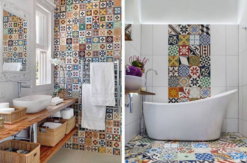 Для украшения ванной хорошо подойдут вставки из плитки в стиле пэчворк