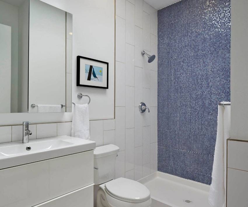 С помощью укладки плитки контрастного цвета на одну из стен можно зрительно углубить пространство ванной комнаты