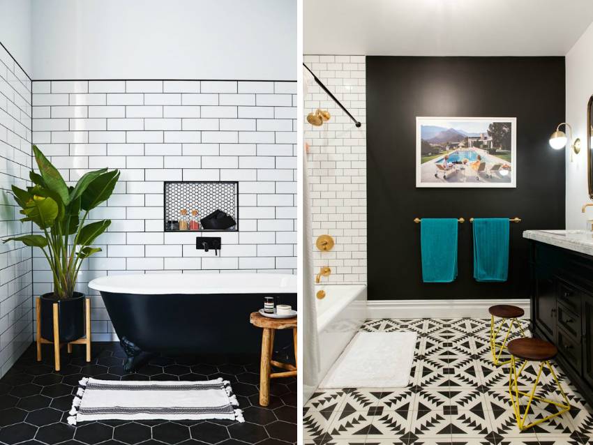 Использование монохромных контрастных оттенков плитки является довольно популярным решением для оформления современных интерьеров ванных комнат