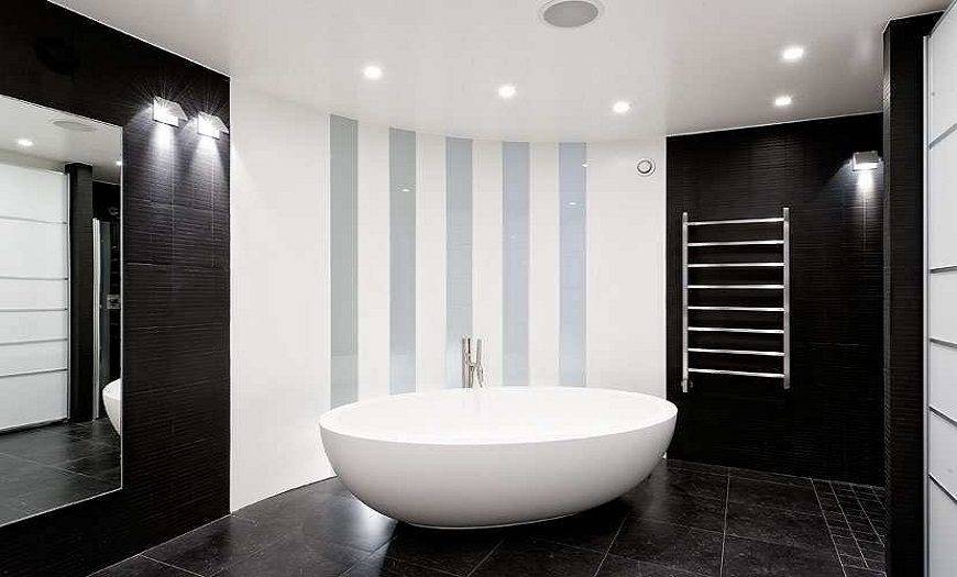 При оформлении санузла нужно внимательно продумать его освещение. Если света будет недостаточно, то вы рискуете получить холодное и неуютное помещение. В ванной 5-6 кв. м. будет прекрасно смотреться многоуровневое освещение. Дополнительно используются потолочные, точечные, напольные или настенные светильники.