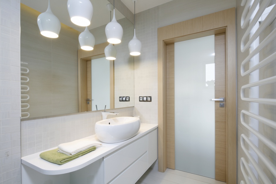 Темная комната всегда кажется теснее, поэтому нужно тщательно продумать расстановку и количество светильников. Яркое освещение требуется в зоне умывальника, в то время как над ванной и унитазом оно ни к чему. При этом свет в маленькой ванной должен быть рассеянным, значит, нам не обойтись без люстры или нескольких точечных галогенных ламп в потолке.
