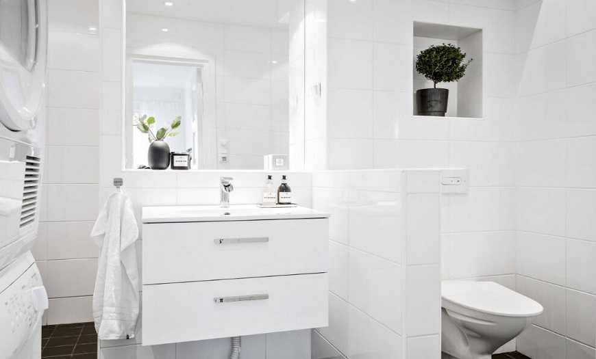 Углубление, декорированное белой плиткой, особенно гармонично вписывается в общую стилизацию помещения, добавляя ему индивидуальности. Такие ниши могут быть расположены возле двери, над ванной, унитазом, около душа или умывальника.