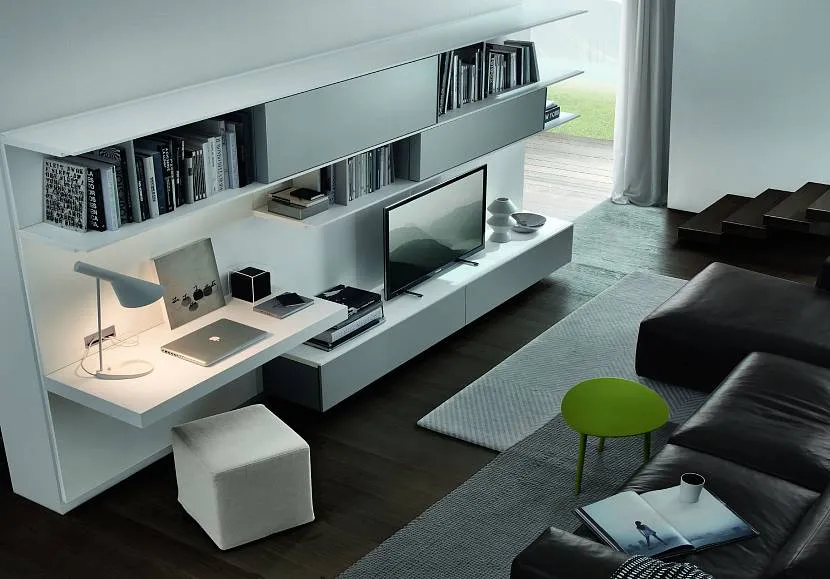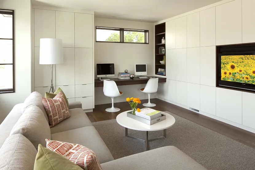 - Рабочая зона в гостиной позволяет не покушаться на место в спальне или кухне, где трудовая деятельность может помешать отдыху или приготовлению пищи.