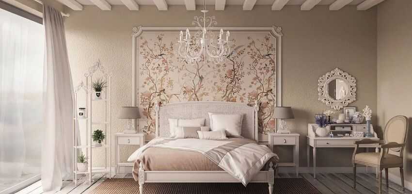 Прованс вызывает ассоциации с деревеньками, расположенными на юге Франции. На этапе оформления спальни в этом стиле задействуют пастельные оттенки: лаванду, нежный розовый, светло-голубой. На текстиле и обоях присутствуют цветочные орнаменты.