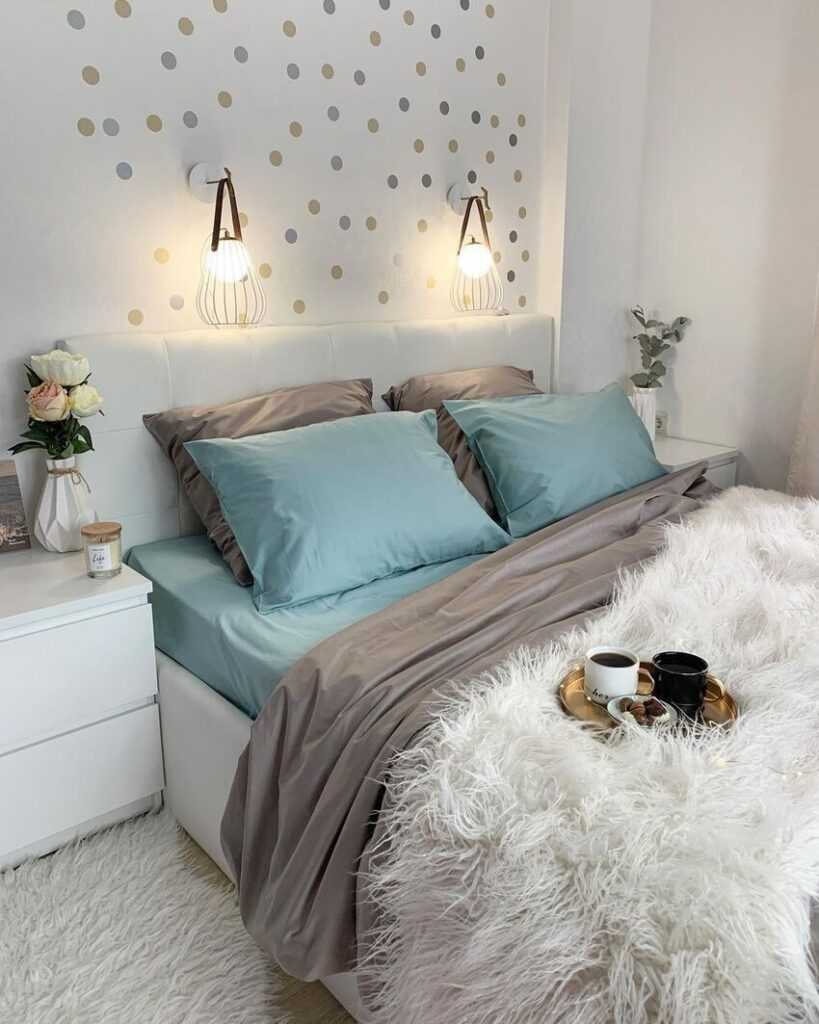 Но в маленькой комнате не стоит слишком сильно «дробить» стены на части полотнами разных расцветок. В такой спальне будет достаточно одной акцентной стены — обычно для этого выбирают стену за изголовьем кровати.
