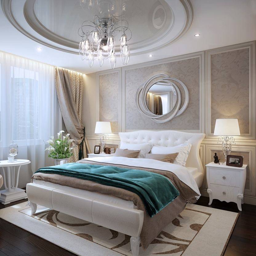 Если ты не представляешь себе спальню без пышного текстиля, люстр и роскошных декораций – рассмотри вариант классического оформления. Цвет отделки лучше выбрать из молочной, оливковой или сиреневой палитры – эти цвета будут отлично сочетаться с лепниной, хрустальными люстрами, золотистыми узорами декора и, конечно, дорогой деревянной мебелью с резными узорами.