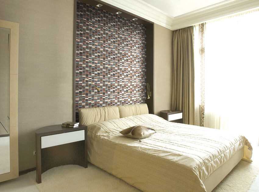 Стена в спальне над кроватью может быть проявлением творчества и фантазий, она оформляется плиткой, обшивается деревом, текстилем, картиной, фальш-окном, рамками, фотопанелями.