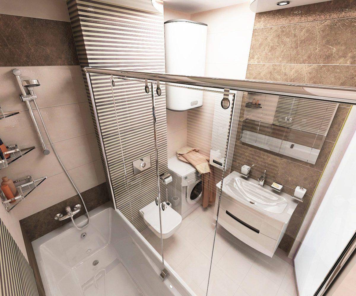 В санузле площадью менее 3,5 кв.м. желательно зонировать пространство. Ванну заменить душевой кабиной или сделать сектор для принятия водных процедур, ограниченный стеклянной перегородкой, а унитаз и раковину установить отдельно.