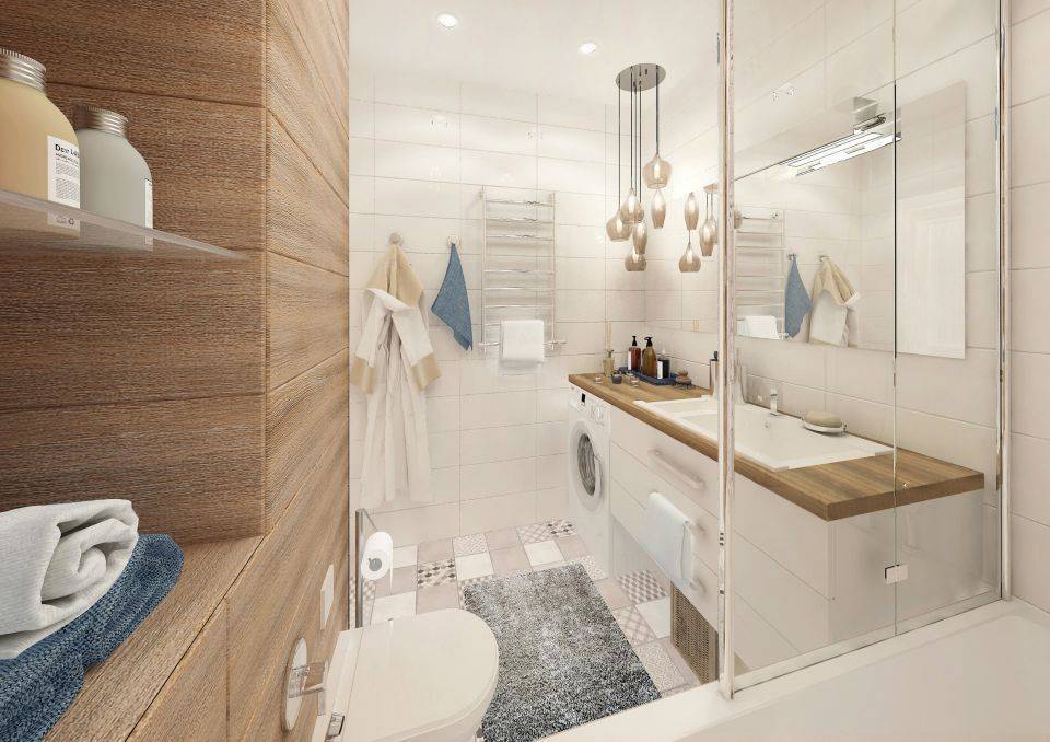 Современные модели сантехники и бытовой техники отличаются компактностью, благодаря чему в помещении можно разместить все необходимое.