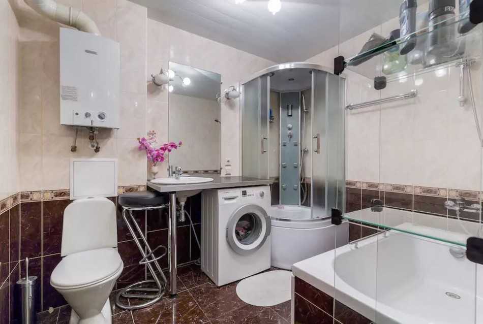Если площадь позволяет, то стиральную машину и водонагреватель тоже лучше скрыть в нише, это придаст более привлекательный вид интерьеру.