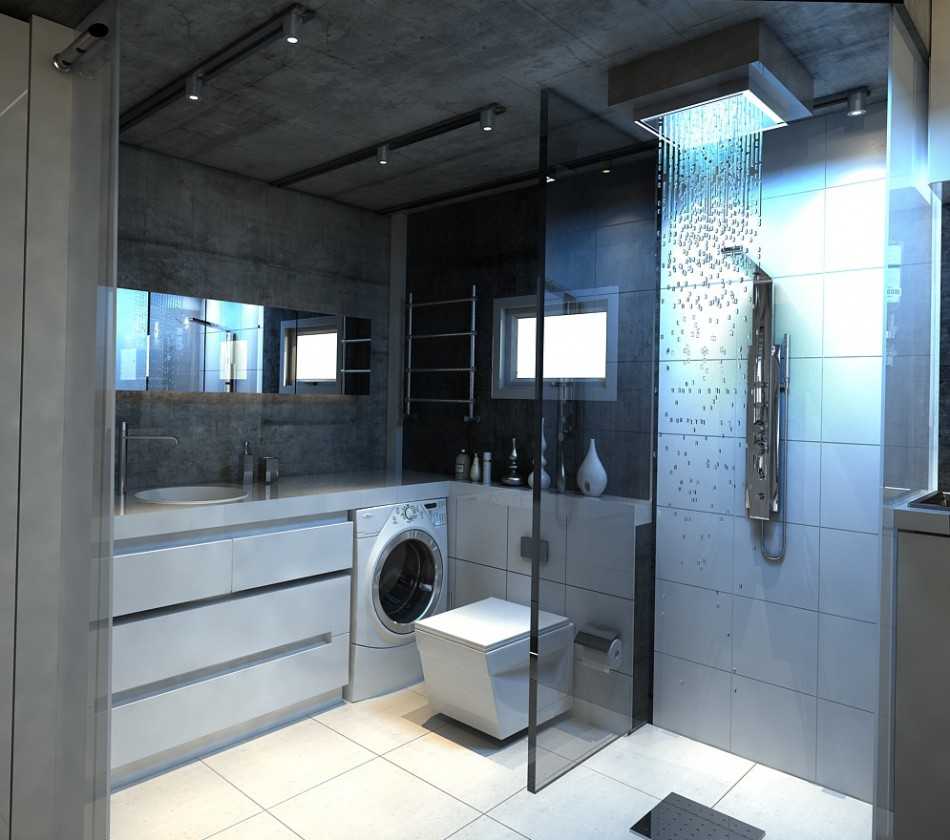 Иногда выбор между ванной и душевой кабиной делается с учетом занимаемой площади, когда помимо стандартной стиральной машины хочется поставить еще что-то. Окончательный результат выглядит так: