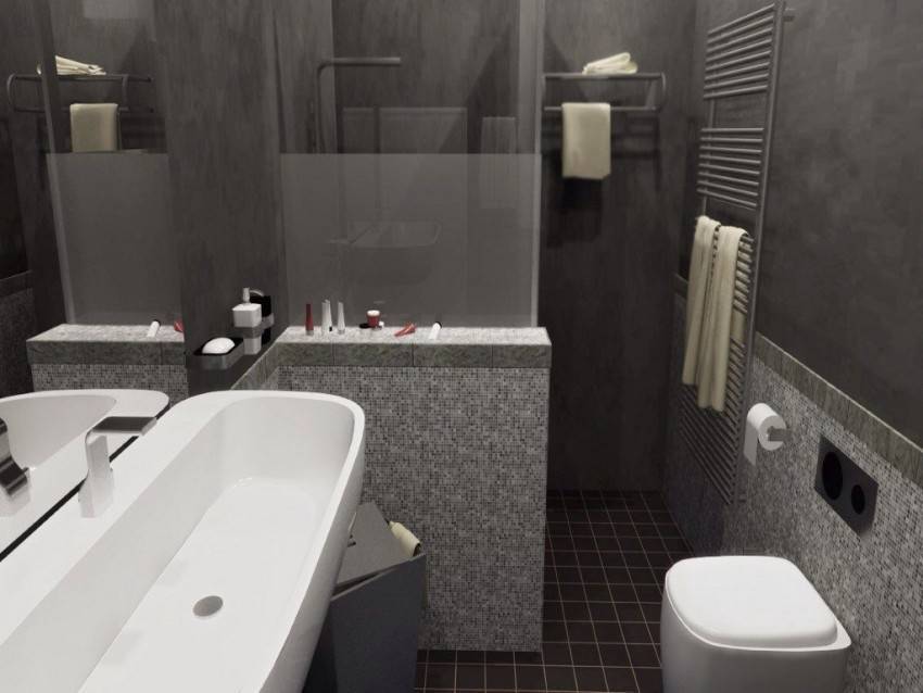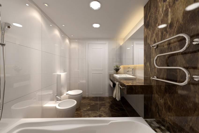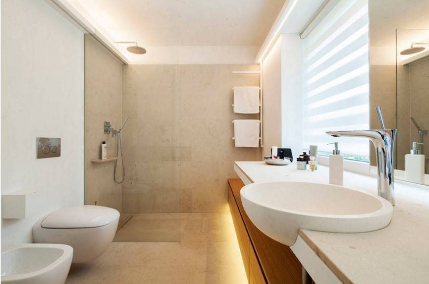 Отделка стен в ванной комнате выполнена из керамогранитного камня