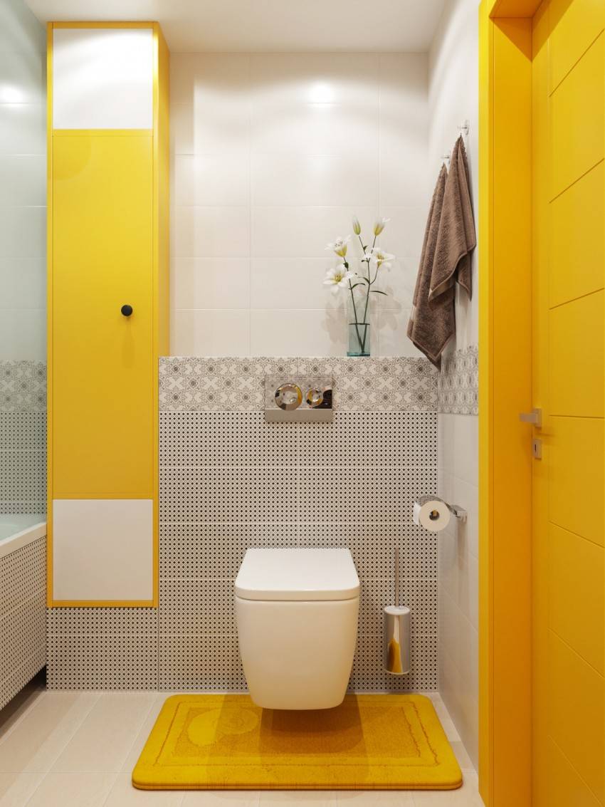 Совсем другой интерьер можно получить, сдвинув унитаз немного в сторону, или повернув его к стене, соседствующей с проёмом. Но в этом случае перед белым другом должно остаться минимум 70 см свободного места, чтобы было удобно пользоваться.