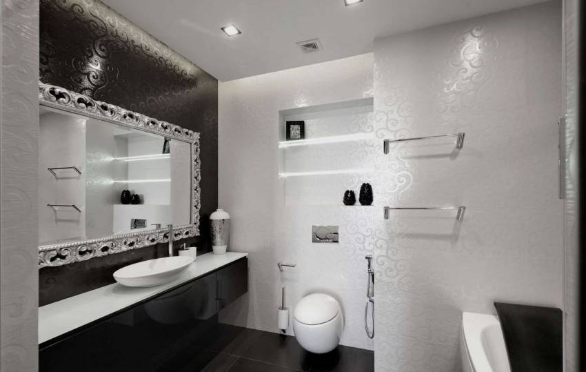 Душевая кабина, выложенная крупным камнем, придаст изысканный вид и оттенок роскоши, а также черные и белые плитки на разных поверхностях в санузле, в стиле арт-деко – придадут неповторимое решение интерьера.. Отделка стен в ванной комнате выполнена из керамогранитного камня