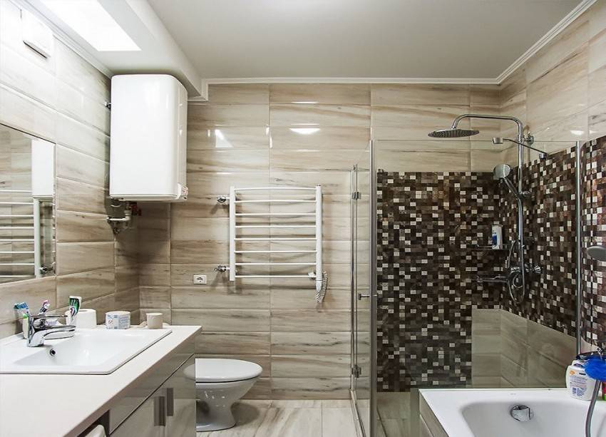 Блок располагается между сантехническим оборудованием и мебелью, что практично, удобно и, самое важное, безопасно при эксплуатации