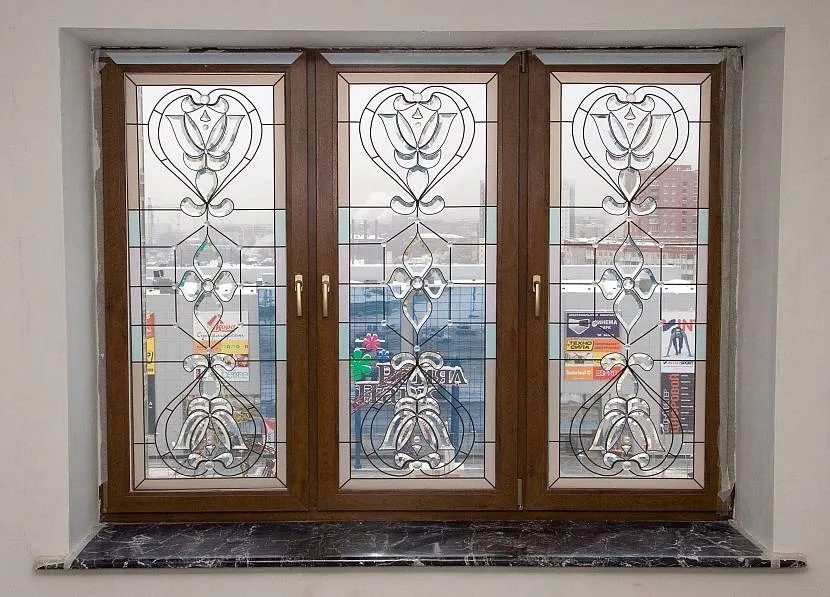 - Витражное. Вариант стекла для классического, ретро или деревенского стиля интерьера. Подобное покрытие изготавливается в нескольких оттенках, имеет различные геометрические орнаменты и рисунки. Больше подходит на многосекционную оконную раму.