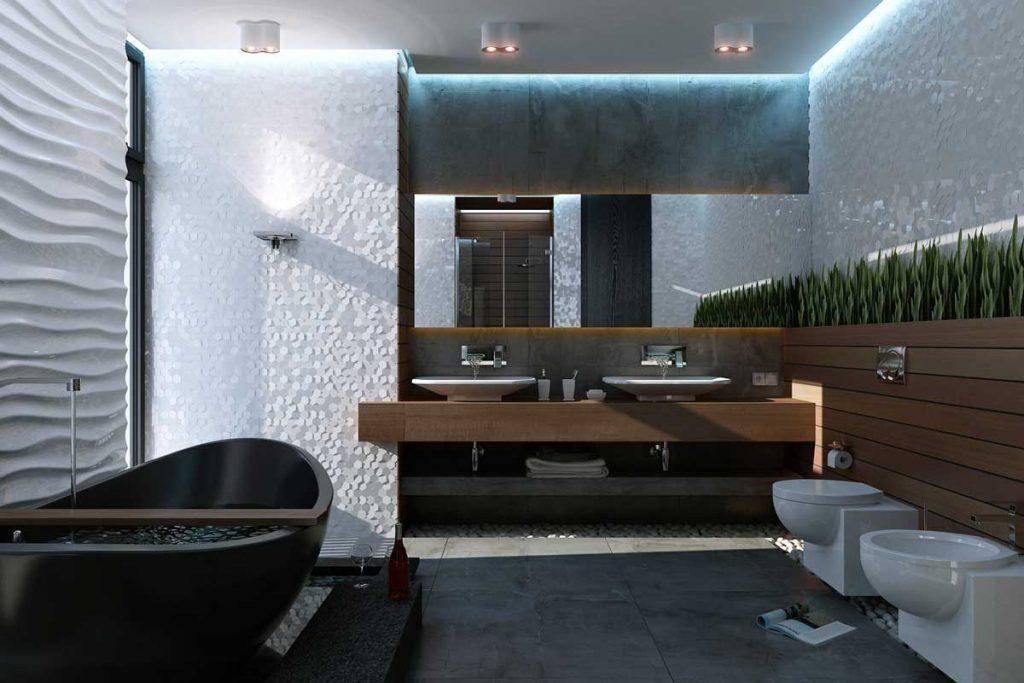 - На стенах часто можно встретить отдельные источники освещения, которые с помощью своего света выделяют предметы интерьера: раковины, унитаз и другие.