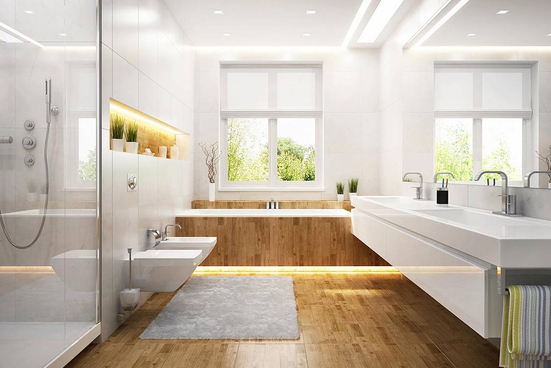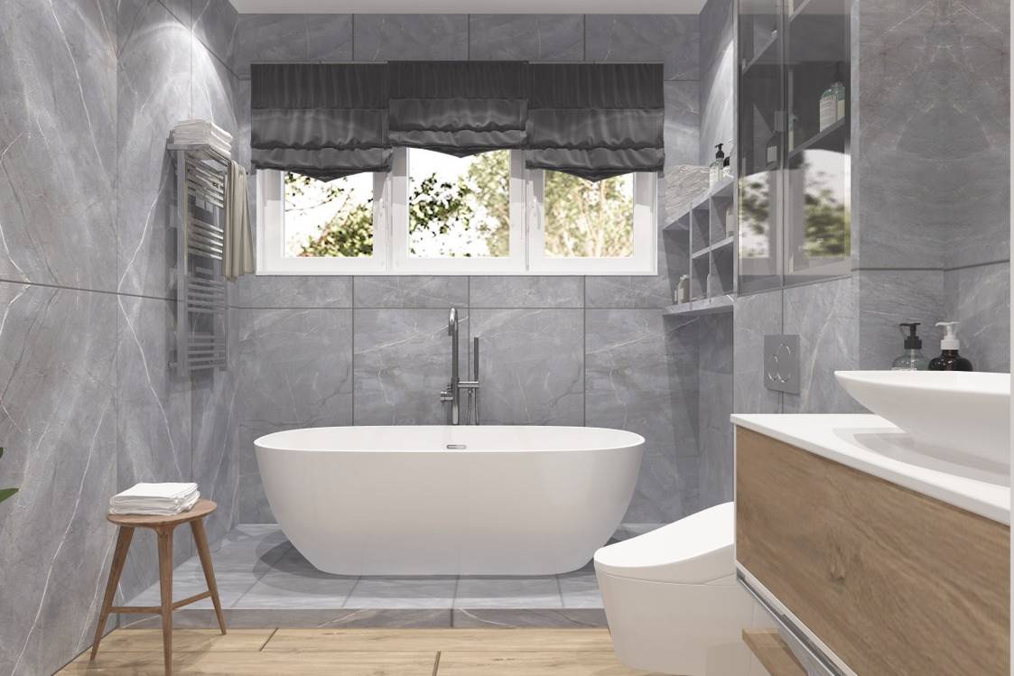 Современные стили дизайна хорошо сочетаются и между ними нет чётких границ. Наиболее актуальные варианты плитки — имитация дерева, камня, бетона. Даже двух видов такой плитки достаточно, чтобы разделить ванную на зоны.