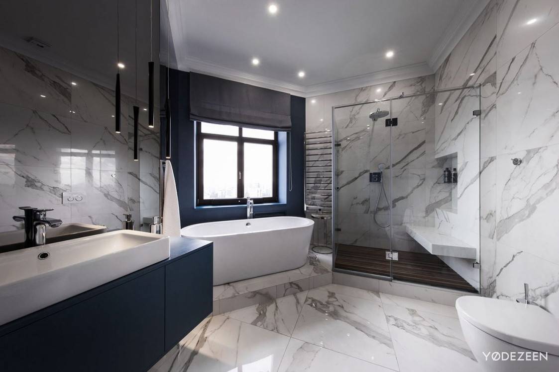 Хотя мы не очень любим классические стили и обычно не советуем их использовать, для интерьера совмещённой ванной это неплохой вариант. Речь идёт не о резной мебели и лепнине, а об использовании плитки под мрамор и пастельных цветов.