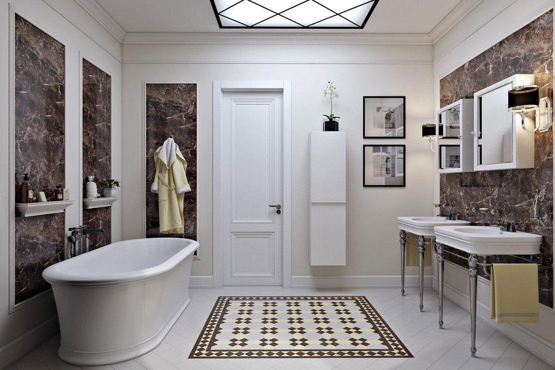 При таком размере критично важной становится правильная укладка и подрезка плитки. Она важна при любом размере плитки, но при большом, а именно такие должны быть в классических дизайнах, это просто критично