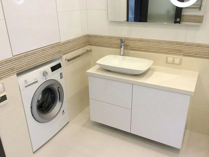 А вот если площади санузла не хватает, обрати внимание на совмещенный монтаж. Сейчас даже продаются готовые комплекты из узкой и компактной стиральной машины с раковиной, которая устанавливается прямо на нее
