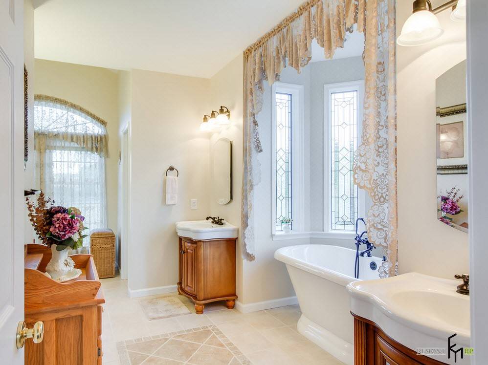 Для помещения на первом этаже по понятным причинам лучше выбрать плотные шторы или портьеры, а для светлой ванной подойдут лёгкие занавески.