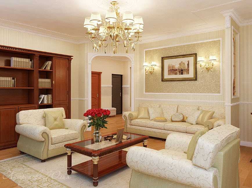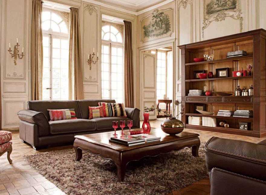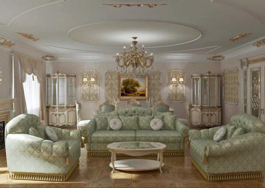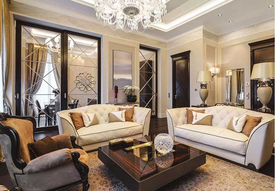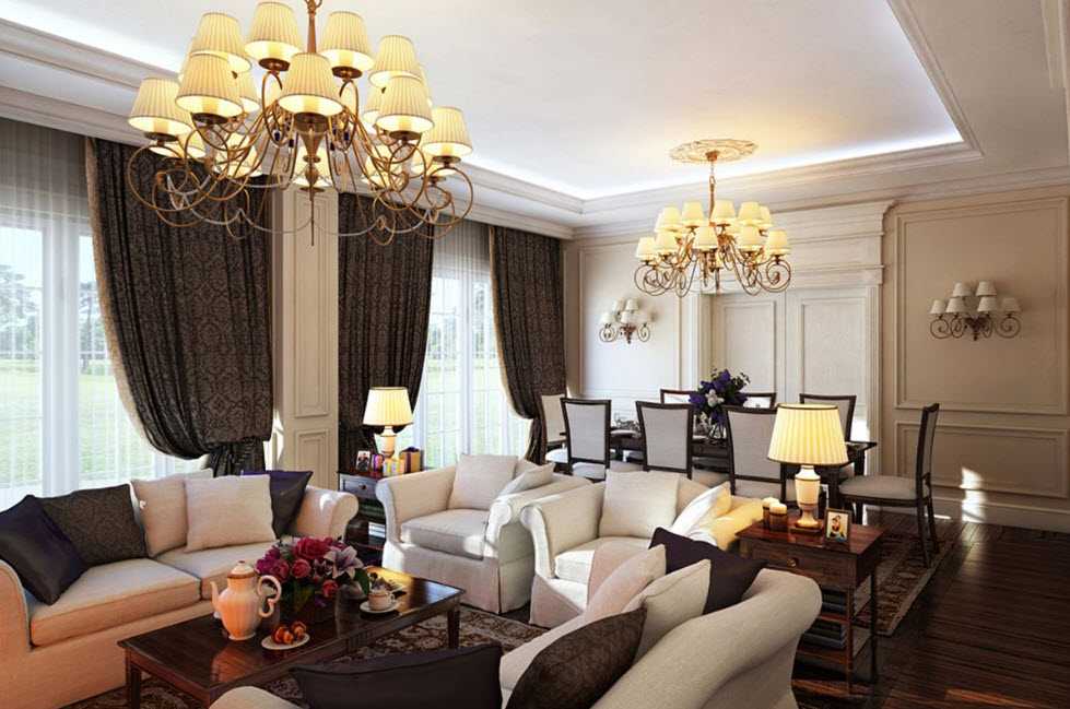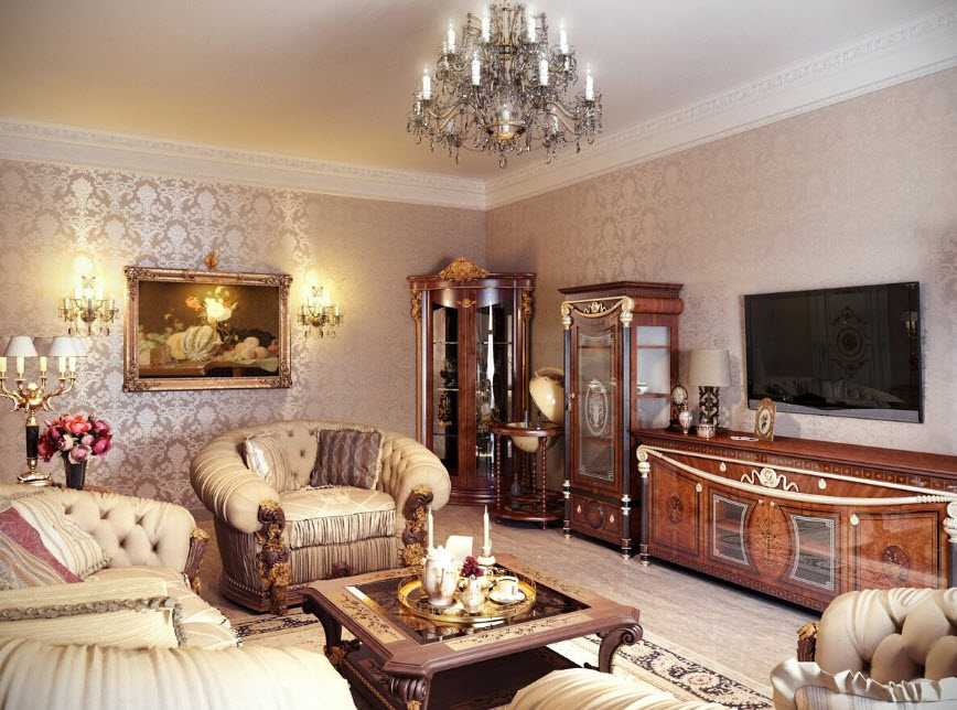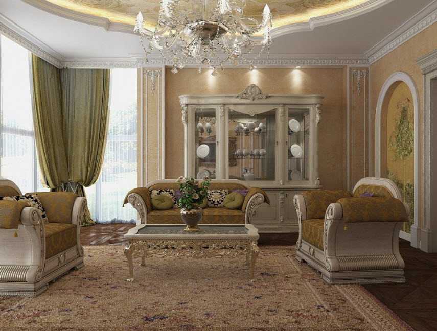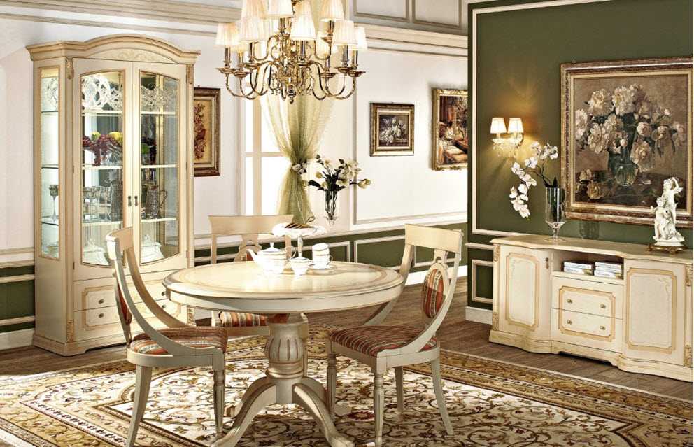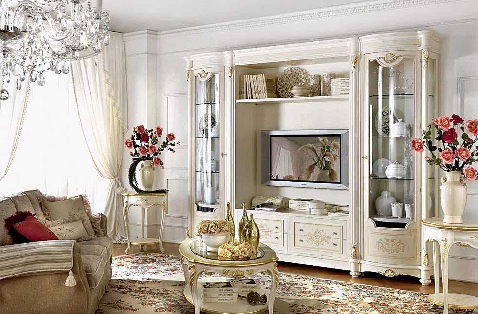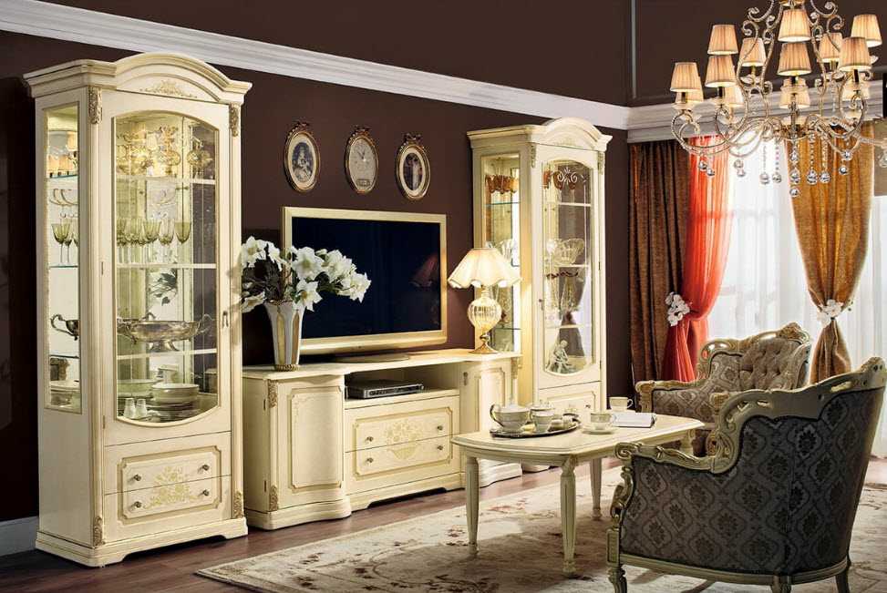 Мебель классика чаще всего устанавливается в гостиных, так как эта комната предназначается для приема гостей и должна олицетворять красоту и уют. Желательно не покупать отдельные элементы, а приобрести ансамбль, который будет объединен одним цветом, узором и текстурой. Массивное трюмо, изящный столик с витыми ножками, кресла и большой диван, стенка во всю стену.
